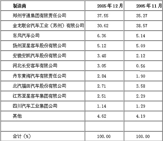 2005年1-12月份,前十名中型客车制造商的市场集中度达到93.79%。其中,前五名中型客车制造商,金龙联合汽车工业(苏州)有限公司、郑州宇通集团有限责任公司、扬州亚星客车股份有限公司、安徽安凯汽车股份有限公司和江苏亚星客车集团有限公司的市场集中度达到77.24%。