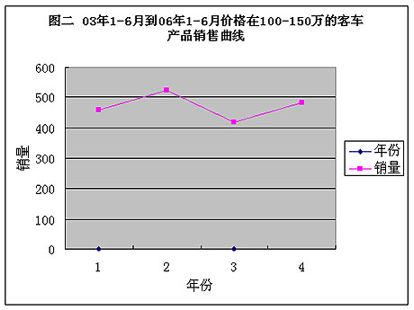 由表一我们可以看出:从03年到05年,价格在100万以上的客车销量一直在1700辆左右徘徊,06年销量估计可能达到1800-2000辆左右。而从03年1-6月到06年1-6月,销量也就在700-800辆之间,销量曲线如下: