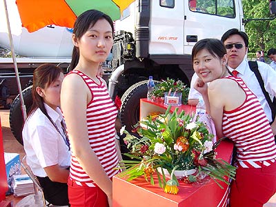 香车美女是每次车展的一大靓点,本次车展也在例外,随着上世纪90年代后期汽车展览经济的兴起,汽车模特租赁费用也扶摇直上,据悉,不少模特早在一年前就和汽车厂家签约。历届车展模特与其他产品模特没有两样,主要是身材高挑、摆个姿势、露脐罩胸、耍点风骚。由于这些模特经过专业礼仪训练,因而笑容呆板、动作简单、应变能力差,对汽车知识知之甚少。针对一般模特存在的问题,安徽江淮客车有限公司独树一帜,加大校企联系,从安徽大学(简称安大)02级生化系和03级外语系各聘来一位在校大学生帮助做好展会接待工作。