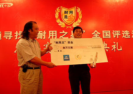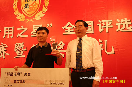 | 郑州宇通客车股份有限公司副总工程师吴晓光为宇通“耐用王”获得者朱新文颁奖 |