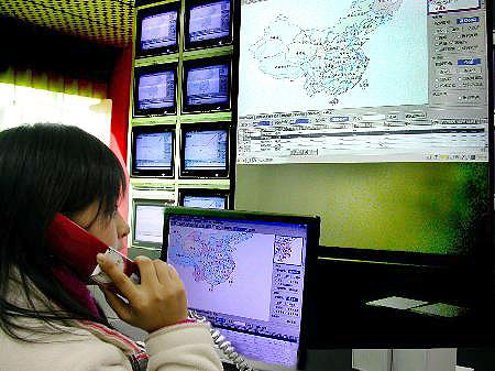 12月28日,湖南省邵东县湘运客运分公司监控中心的工作人员正在监视营运客车的运行情况。该公司投资50万元建成的这座现代化监控系统,实行24小时监控,掌控公司营运网络的167辆客车的运营情况,确保春运安全。