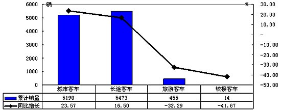 2005年1-8月不同种类大客整车累计销量及销量同比增长率