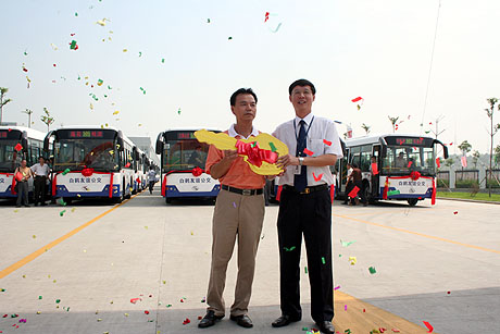 金龙公司陈志强副总经理(右一)将"金钥匙"交到白鹤友谊公交公司李明泰总经理手中