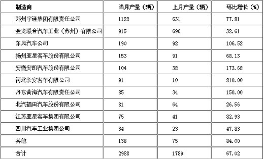 2005年12月份,全国共生产中型客车2988辆,环比增长67.02%。其中,前十名中型客车制造商产量达到2850辆,占本月中型客车总产量的95.38%。