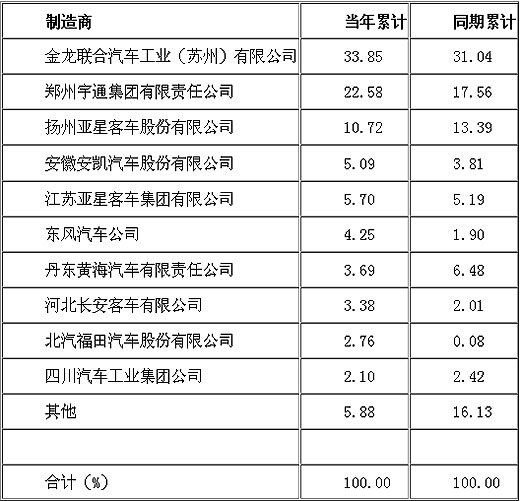 2005年1-12月份,前十名中型客车制造商的市场集中度达到93.79%。其中,前五名中型客车制造商,金龙联合汽车工业(苏州)有限公司、郑州宇通集团有限责任公司、扬州亚星客车股份有限公司、安徽安凯汽车股份有限公司和江苏亚星客车集团有限公司的市场集中度达到77.24%。