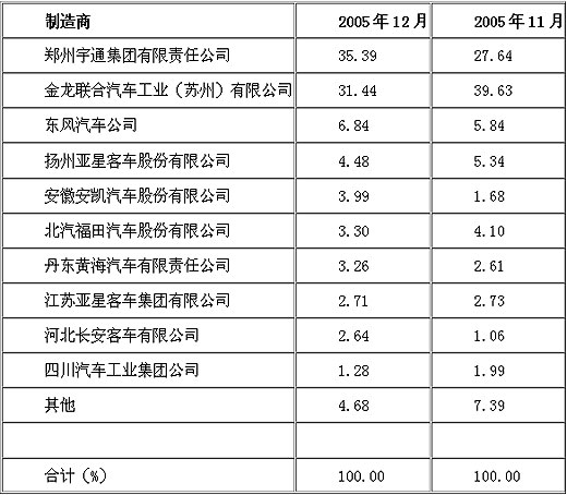 2005年12月份,前十名中型客车制造商的市场集中度达到95.32%。其中,前五名中型客车制造商,郑州宇通集团有限责任公司、金龙联合汽车工业(苏州)有限公司、东风汽车公司、扬州亚星客车股份有限公司和安徽安凯汽车股份有限公司的市场集中度达到82.13%。