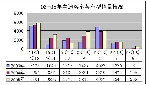 从车型长度来看,11米以上客车和9-10米客车的销量比重有所下降,而10-11米客车和9米以下客车的销售比重有所增加,9-10米客车结构的变化与整个行业的结构变基本一致,10-11米客车和8-9米客车正是宇通公司2004年陆续推出的新产品所发挥作用的结果。