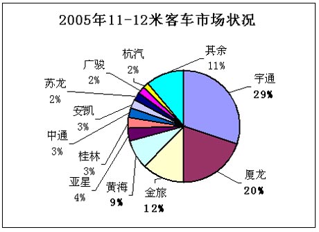 2005年11-12米卧铺车销量为3433辆,宇通客车在卧铺车市场占据了半壁江山,高达51%的市场份额,与其它企业相比占有绝对的优势。分置2至5位的企业为桂林大宇客车、厦门金旅客车、安凯客车和安凯股份客车,其市场份额分别为12%、9%、7%和6%。