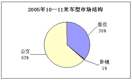 2005年10-11米客车共计销量14543辆,其中公交车占63%的市场份额,座位车为36%,卧车仅为1%。