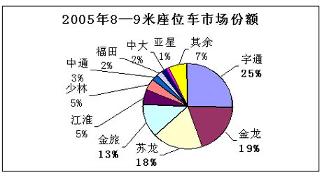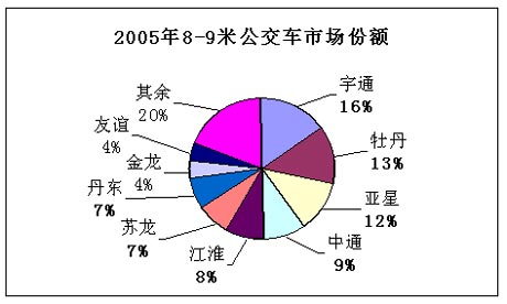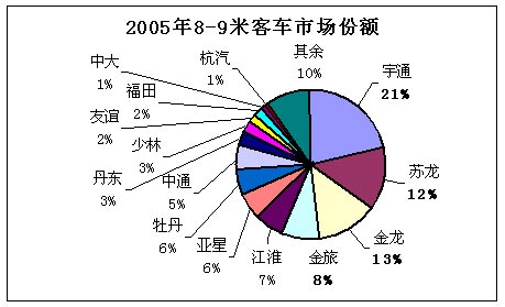 在2005年8-9米的客车销量中,宇通客车、厦门金龙、苏州金龙、厦门金旅、江淮客车、亚星客车和牡丹客车排名1-7位,市场销售份额分别为21%、13%、12%、8%、7%、6%、6%。前七位企业的市场销售集中度达到73%。宇通客车的销量超过了总销量的1/5。