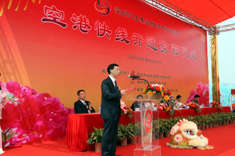 苏州金龙副总经理黄书平在深圳宝安国际机场空港快线开通仪式上讲话   据了解,此批投入运行的海格大巴为豪华座位车,在车型的选择上,充分考虑了道路特征和服务群体需求,配置了国Ⅲ排放标准的大功率发动机、ABS制动系统、电涡流缓速器安全系统,在车内配置豪华内饰和多种人性化设施,所有车辆上都安装了GPS智能调度系统和电子安防系统,为乘客提供安全、舒适的乘车条件。