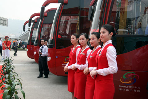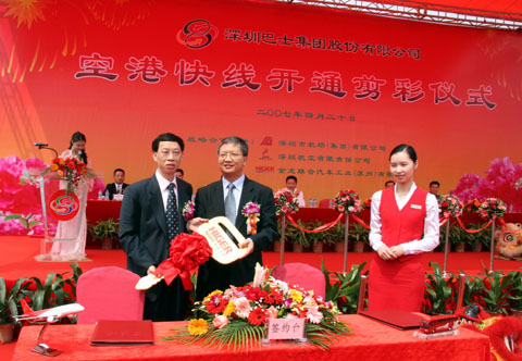 | 4月20日,在深圳宝安国际机场举行的空港快线开通仪式上,164辆海格客车正式投入连接深圳机场与深圳各区的6条新线路运营。空港快线大部分行驶高速公路,机场乘客通过乘坐空港快线直达机场候机楼,免去频繁转车、搬运行李等种种不便,并以"准航空式"服务,将空中服务延伸至地面交通,真正全方位实现"空中地面的无缝对接"。今后,无人陪伴儿童或老人的特殊旅客服务将延伸到巴士乘车处。不久,还将开展远程值机服务,深圳航空公司将把值机手续前移到空港巴士上,让旅客在前往机场的路上就能换取登机牌,免去在机场排队等候之苦。