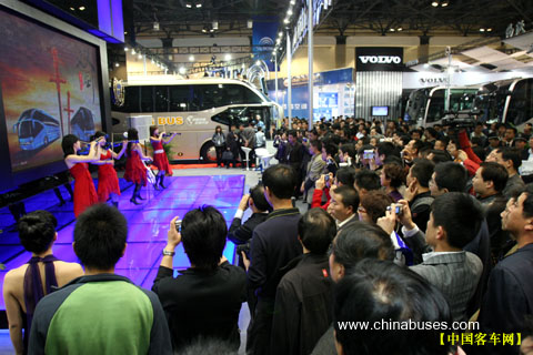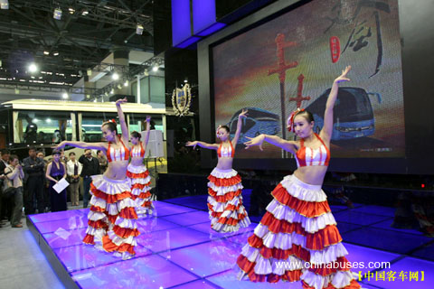 4月18日9:30北京客车展正式开始,宇通的女子四人乐坊组合就分别拿着小提琴、大提琴等乐器登台亮相,激情热烈的音乐随即在宇通展台蔓延开来,立刻吸引了大批观众围观拍照,宇通也成了开展时人气最旺的展台。随后,四位美丽的"小天鹅"身着洁白的芭蕾舞裙开始在舞台上翩翩起舞,再次引来了现场观众和媒体记者的阵阵快门声。10:00左右,宇通客车副总经理和建设部科学技术委员会城市车辆专家委员会主任李树豪、中国公路学会客车分会理事长邹虎啸等业界专家一道揭开了"双剑"ZK6127H系列旅游版和客运版的神秘面纱,5名身材高挑的俄罗斯车模从红色绸缎后一一走出,开始在展台上表演优雅的走秀,成为宇通双剑亮相的一大看点。 而当身着红色摆裙的表演者逐一登上宇通展台后,现场再次出现阵阵骚动:"快看,又有新表演了"等话语在人群中此起彼伏,女孩子们挥洒自如奔放大气的西班牙舞蹈使宇通的展台被围得水泄不通。无论是从表演的种类和花样,还是现场的人气指数上看,宇通无疑是当场最具风情的客车展台。零部件厂家也不甘示弱,双钱轮胎在展台布置上就以中国传统元素为主要表现手段,无论是大红的中国结,还是身着传统大红大绿被面式旗袍的模特,乃至憨态可鞠通体金黄的财神公公,都有着浓浓的中国风味。
