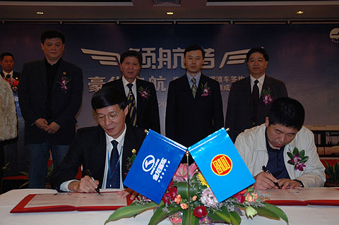 仪式上,大金龙副总经理陈志强和北京空港航空地面服务有限公司黑龙江分公司经理刘利峰共同签署首批"领航者"摆渡车购销协议,后者也由此成为了大金龙机场摆渡车的首家用户。此次签约举标志着中国客车整车生产企业不能自主研发、生产和销售专业机场摆渡车的历史宣告结束。大金龙总经理江世煌和国家民航总局机场司标准资质处处长高天分别致辞祝贺,来自国家民航总局的领导及全国各地机场、航空公司的负责人见证了签约仪式。