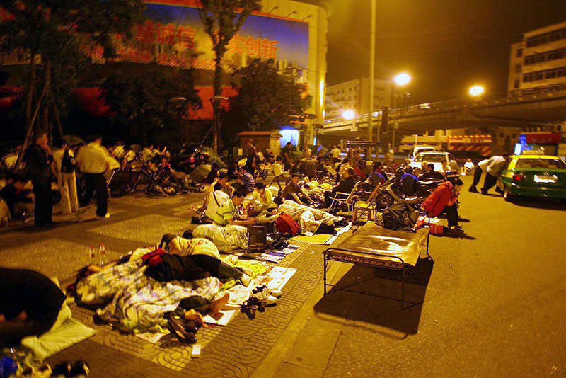 18日凌晨1时,因余震频繁,忙碌了一天的宇通救援队队员们不得不在房间外面露宿,此时成都突降大雨,还伴着雷电。有记者在向其中一名宇通救援队员队员询问当天救援情况时,他的话音越来越小,记者扭头一看,这名救援队员说着话就靠着护栏睡着了。