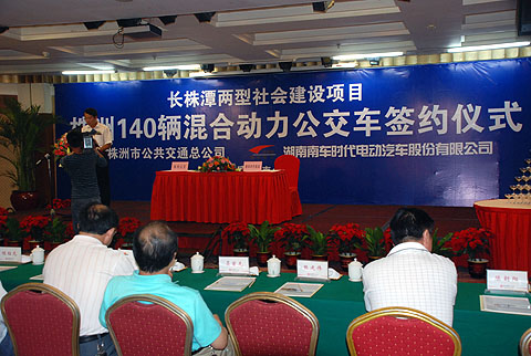 签约现场   南车时代是一家集轨道交通、新材料和新能源三大产业版块于一体的高科技公司,拥有七大业务主体、两家上市公司、两个国家级技术中心、两个企业博士后科研工作站和两家大型合资公司。这几年,南车时代通过产业重组和资源整合,成立了国内首家最大的专业化电动汽车股份公司,并在不到一年的时间里,相继完成了人才引进,技术升级、厂房兴建以及配套服务体系建设等方面的工作。   为迎接北京奥运会、推动“两型社会”建设和城市创卫工作,株洲市公交公司大力实施公交环保车项目。南车时代研制的TEG6128HEV型混合动力公交车因为节油可在20%以上,尾气排放可减至4成左右,噪音污染少,造型新颖等优点,赢得了株洲公交的青睐和认可,双方在短时间达成140台公交车采购协议,创造了迄今中国电动汽车最大批量采购记录。