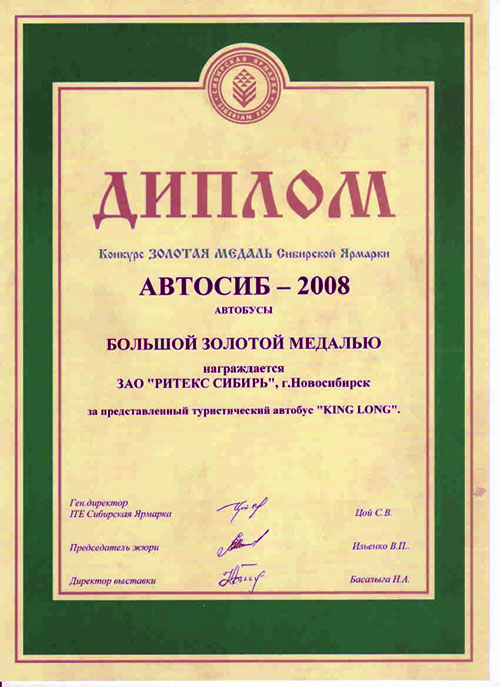 5月30日,在俄罗斯新西伯利亚市举办的西伯利亚展览会上,大金龙XMQ6127欧洲之星车型与俄罗斯客车同台竞技,以亮丽的外观和绝佳的性能获得此次展会最高奖项——西伯利亚展览会金奖,成为真正的“欧洲之星”。