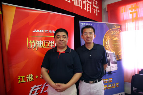 江淮客车销售总公司副总经理王苏荣与湖州长运有限公司副总经理刘中晖亲密留影   节油研讨会,见证坦诚对白   湖州长运有限公司副总经理刘中晖先生在节油研讨会上,肯定了江淮客车举办次此活动的深远意义外,还谈及到当前"生物柴油"的前沿话题,言语之间体现了其对子孙后代能源紧缺的关注,这在一个公司高层领导的层次上看到社会个体的社会责任。刘总对到会的执行层表达了一定要干好这次节油比赛的决心,不仅仅是对战略合作伙伴的支持,而且也是对社会的一种支持。要切切实实通过此次活动不断提升成本管理水平,提高全体员工节油意识,为创建节能型社会尽到企业的责任而作出实际行动。湖州长运公司于2001年与江淮客车建立起共荣双赢的战略合作关系,并通过高层互访、技术交流、不同层次的相互学习,创造了江淮客车"省油王"HK6124百公里油耗18.6L的奇迹,这是共同的荣耀,是双方联盟合作努力的硕果。