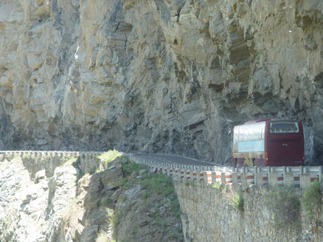 我们的海格V92一路都向上爬升,沿着蜿蜒曲折的山路。透过车窗往外看,满眼的青翠,而车身后尽是被抛远的绵延弯道,比起九寨沟路段的九道拐有过之而无不及,几乎所有的山路都像是一个个被压扁了的S形,弯弯相连,一路向上盘旋。驾驶员冷工在拐过一个上坡弯道时,感慨道:"幸好这次开的是海格V92,一般的车在这种路上早就熄火了。"越往上走,天越阴霾。不知过了多久,我们发现前方的景色豁然间开朗了,放眼望去,层峦叠嶂,延绵不尽,大有一览众山小之势,仿佛一幅泼墨的写意山水画。原来我们的车已开到山顶,俯瞰刚才走过的路,犹如一条灰色衣带在郁郁葱葱的树木里时隐时现。