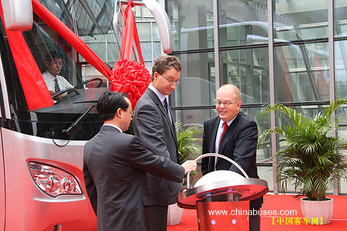 瑞典驻华公使严波,瑞典斯堪尼亚中国首席代表何墨池,苏州金龙总经理吴文文共同启动新品上市仪式