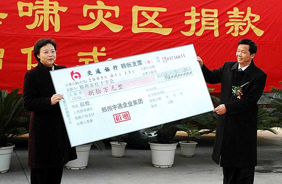 1月14日,宇通企业集团总裁汤玉祥、员工白振刚分别代表集团和员工将援助印度洋海啸灾区的捐款880978元捐赠给郑州红十字会。郑州市副市长高建慧代表红十字会接转了此笔款项,这是迄今为止河南省企业届最大的一笔捐款。
