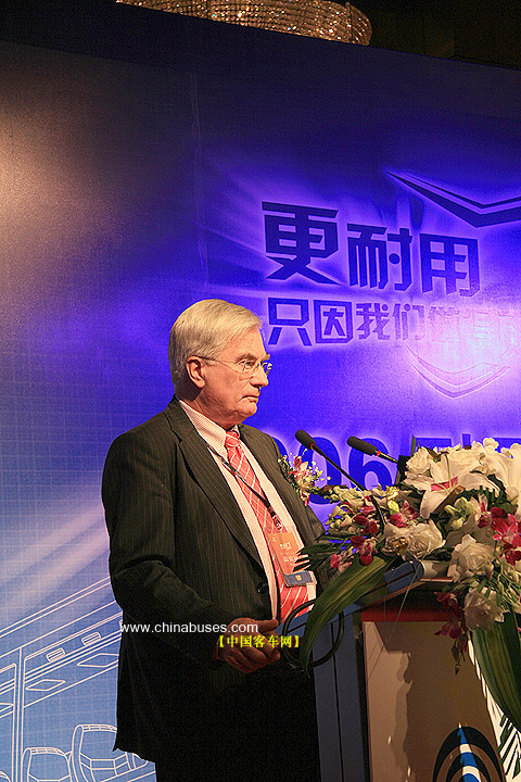 现在人类的流动问题是世界上最重要的问题之一,而客车制造业为解决这个问题提供方案。今天我很荣幸的出席"2006宇通客车耐用盛典"并在此演讲。因为我发现中国客车行业的发展对全球客车行业的发展起着重要作用,所以我和我的一位技术专家Jan