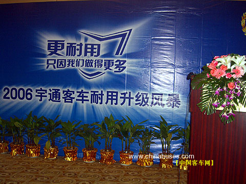 活动在酒店二楼茉莉厅举行,整个会场洋溢着"宇通蓝",成了一片蓝色的海洋。进入会场,最先映入人们眼帘的是主席台前巨大的蓝色背景,让人感觉到一种无法抗拒的气势。上面"'更耐用 只因我们做得更多'2006宇通客车耐用升级风暴"的字样格外引人注目。在会场的周围,整齐有序的排列着此次活动的宣传展架,一个一个,好比一朵朵蓝色的浪花。