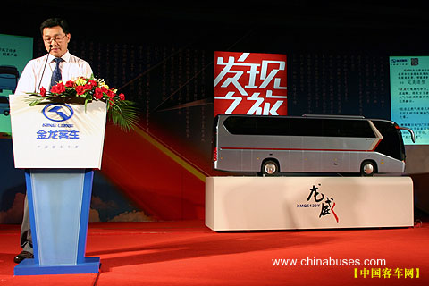 大金龙总经理助理林闽雄讲话 在林总的精彩致词之后,大金龙的客户代表山东省交运集团的葛乐明总经理站在客户的角度,阐述了对金龙公司及其产品的认识,并全面诠释了山东交运集团近年来与金龙客车的情缘以及对金龙公司的期待!随着来自客车和客运两个领域的专家的经典致词之后,此次产品推介会的主角--龙威车模登场,把此次活动推向了高潮,同时大金龙技术部副经理谭鸿迅先生全面讲解了三款车的独到之处;