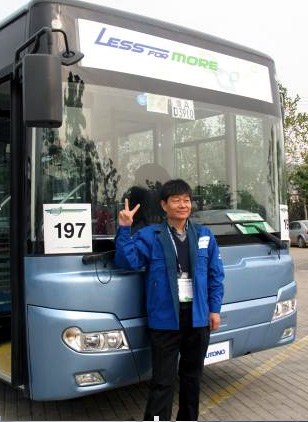 在正式进行技术比武的前一天,很多参赛车辆在赛场做训练,一辆车在将近120秒的时间内完成了钻杆项目,让组织方的工作人员颇觉欣慰;魏师傅驾驶着宇通的ZK6126HGA,84秒轻松完成!组织方的工作人员大为惊异,宇通的工作人员急忙小声提醒"保留实力!保留实力!"。魏师傅连忙边点头边嘀咕"没办法,车的操控性太好,这主要是车的原因不是人的问题"。赛前,豪爽、风趣的魏师傅还让我给他拍下了这张预示胜利的照片。