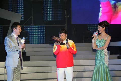 张湘祥接过大金龙车模,重现2008夺冠之吻