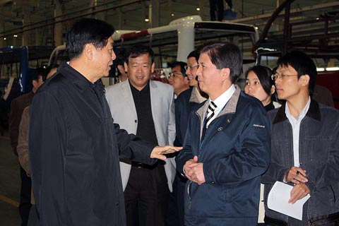 简短汇报会后,于副书记和其他省市领导一起视察了大金龙总装车间。在总装车间里,于副书记看到一辆XMQ6121在制车,欣然上车察看体验。江世煌总经理向其介绍,该车型在2006年获得世界客车博览最高奖——年度客车大奖,并在之后的市场竞争中有着上好表现。