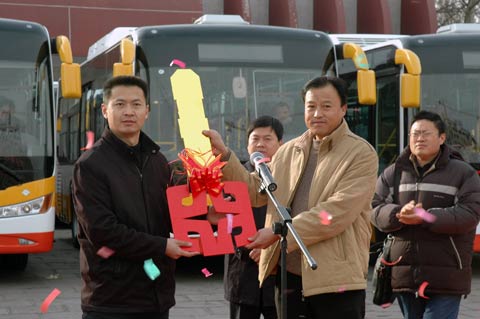 中通客车控股股份有限公司副总经理贾开潜在发车仪式上致辞,对远道而来的潍坊公交总公司副总经理刘效党等来宾表示热烈欢迎,同时指出在金融危机和税费改革等背景下,中通客车作为首家通过国家新能源汽车生产准入资格审查的客车企业,一定会和各交通运输企业加强友好合作,共谋发展,构建长期稳固的战略合作伙伴关系。潍坊公交总公司副总经理刘效党在仪式上也发表了热情洋溢的讲话,对企业今后的发展和与中通客车的战略合作充满信心。最后潍坊公交刘总从中通客车贾总手中接过了象征车辆交接的金钥匙,一辆辆崭新的CNG公交客车列队从中通客车公司大门缓缓开出,中通客车与潍坊公交公司交接车仪式圆满结束。