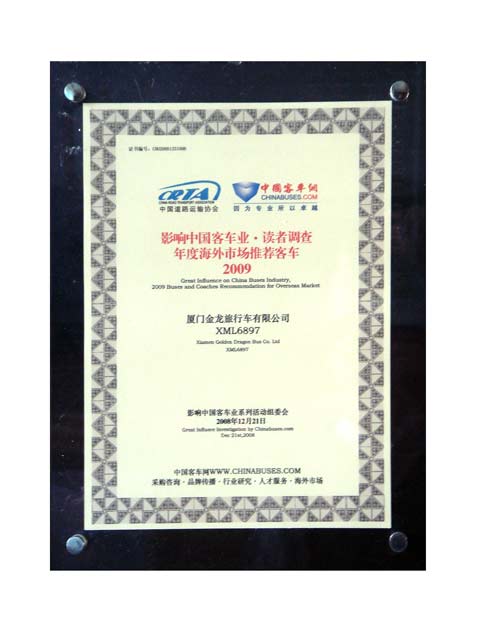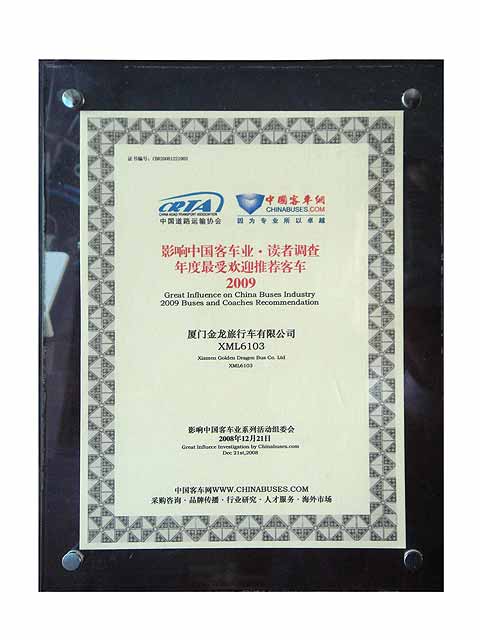 2008年12月21日,由中国道路运输协会道路运输装备及安全节能工作委员会、完美作业网有免费视频联合举办的委员会年会暨道路运输、客车品牌、安全、节能论坛在云南昆明隆重举行,并同期举行“影响中国客车业·完美作业网有免费视频读者调查公布暨颁奖典礼”。厦门金旅XML6103和XML6897两款精品客车以其卓越的品质、强大的品牌实力等分别荣获“2009年度最受欢迎客车”以及“2009年度海外市场推荐车型”两项殊荣。