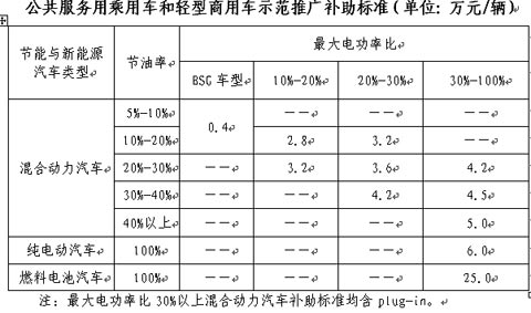 第九条 补助标准主要依据节能与新能源汽车与同类传统汽车的基础差价,并适当考虑规模效应、技术进步等因素确定。公共服务用乘用车和轻型商用车示范推广具体补助标准见附表一,城市公交客车示范推广具体补助标准见附表二,特种车辆补助标准参照上述补助标准确定。