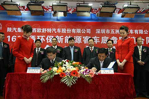 2009年3月7日下午三点,陕汽集团欧舒特汽车股份有限公司供深圳五洲龙汽车有限公司1600台客车底盘签约仪式在西安隆重举行,陕汽集团董事长方红卫、总经理袁宏明,欧舒特客车总经理张海利、五洲龙客车董事长张景新、副董事长杨志远、总经理胡景涵等有关领导出席签约仪式,双方高层共同见证了八年来共同合作的历程,并用实际行动表达了日后更深一步合作的诚意。