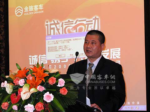 来自四川省公路客运、旅游交流、公交公司等客户代表300多人参加了金旅诚信行动发布活动。厦门金旅集团公司营销总监叶宇亮先生宣布并阐述金旅“诚信行动”的内涵,用户嘉宾代表四川省长途汽车运输公司副总经理陈延明先生对自己多年购客车用客车搞客运的经验与与会代表作了分享,经销商代表四川锦龙汽车贸易有限公司总经理肖晓明先生表达了他对用户的承诺,厦门金旅公司销售公司市场部于洋先生对金旅车身电泳工艺进行了专题介绍,厦门金旅公司技术中心主任孙秋林先生对金旅客车2009年度新产品及新技术作了系统介绍。
