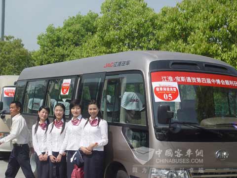 2009年4月28日下午,当安徽省副省长文海英将中博会会旗传递给商务部部长助理王超,转而移交给江西省政府副秘书长胡世忠时,标志着第四届中博会圆满落下帷幕。江淮宝斯通在此次盛会上用于商务专用接待任务也预示着圆满成功,这是继“山东两会”零故障、高品质接待后的又一次荣誉表现,也体现了江淮客车在宝斯通产品上走高端商务接待的民族品牌气节。