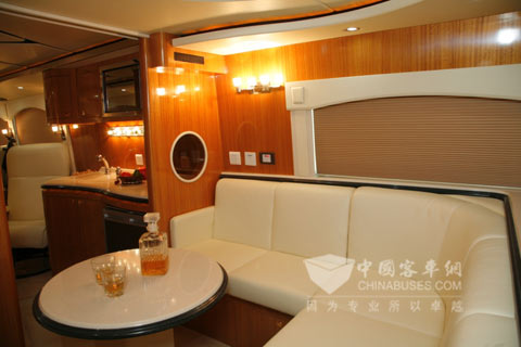记者在车厢内看到,精心设计的厨房、吧台、KTV点歌系统、豪华卫生间等设施,及电视、音响、传真机、卫星接收器、冰箱、微波炉、咖啡机、真皮沙发、衣柜等设备,凸现了整车豪华、尊贵的驾乘乐趣。