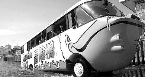 2009年5月5日下午两点,国内首辆水陆两用巴士“冒险鸭”在青岛奥帆中心首次试水,这只既能在路上行驶,又能在水上驰骋的“冒险鸭”,到底是车还是船?又是如何实现水陆转换的?还有哪些鲜为人知的秘密?7日记者进入奥帆中心,对“冒险鸭”进行了一番探访。