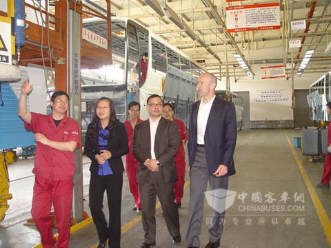 客人们一行在公司副总经理熊良平的陪同下参观了安凯客车新厂区。熊良平副总经理向客人们详细介绍了安凯客车的制造流程,重点介绍了安凯客车全承载车身制造技术、先进的防腐技术和安凯纯电动豪华客车,客人们听后表示赞许,称赞安凯纯电动豪华客车技术领先、业内一流。