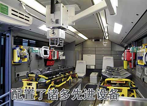 车厢内部还配置了许多先进的医疗设备,包括氧气箱、净化系统、医疗手术辅助系统等等。看到了这样大型的医疗救援车,您会怎么想呢?当交通事故发生时,我们就可以实施较快的有效的治疗了,当然我们还是不希望事故的发生。