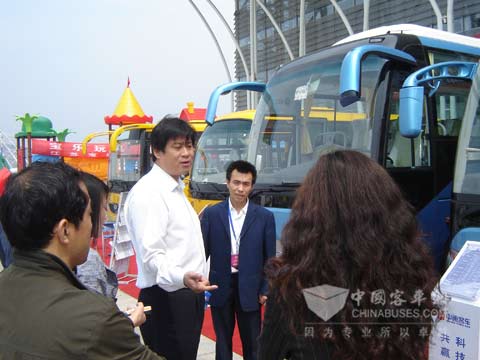 山东省教育厅采购处王处长在中通客车展位听取中通工作人员介绍