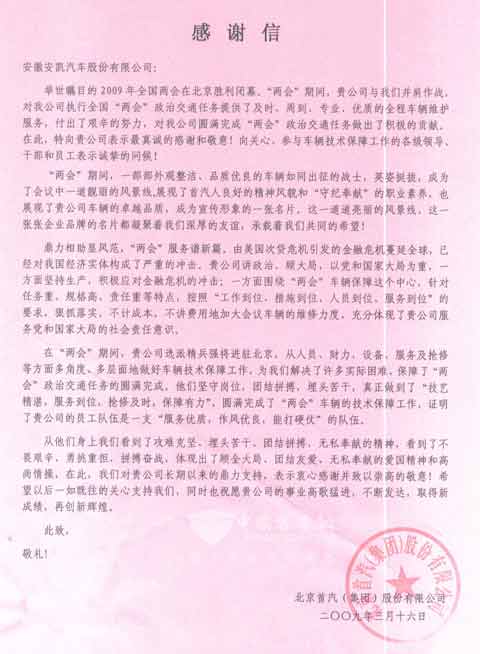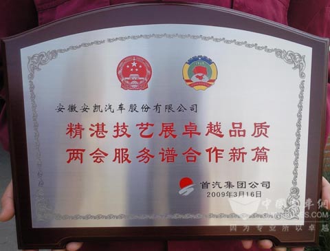 “精湛技艺展卓越品质,两会服务谱合作新篇”,这是2009年全国两会召开之后,首汽集团为感谢安凯客车在两会上的优异表现,赠送给安凯集团的一块牌匾。“从安凯身上我们看到了攻难克坚、埋头苦干、团结拼搏、无私奉献的精神,看到了不畏艰辛、勇挑重担、拼搏奋战,体现出了顾全大局、团结友爱、无私奉献的爱国精神和高尚情操,在此,我们对贵公司长期以来的鼎立支持,表现衷心感谢并致以崇高的敬意!”首汽集团的感谢信充满了真挚。