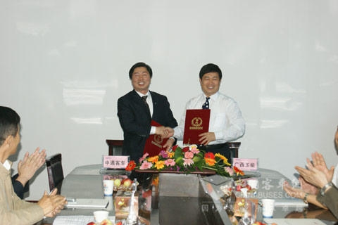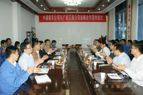 签字仪式上,中通客车总经理时洪功讲到,中通客车与玉柴机器这几年以来的合作在愉快中步步加深,实现了互利互赢。特别是在中通底盘研发的初期,得到了玉柴的大力支持。中通自2003年开始研发生产底盘以来,底盘产量每年以翻番的速度增长,2008年达到了四千多台的产量,其中2700台配套了玉柴产品,占总量的70%。在2008年运作沙特1600台大单的过程中,从产品交货期、成本控制等方面,玉柴公司都给予大力支持,在中通客车的快速发展中起到了很大的支持促进作用。