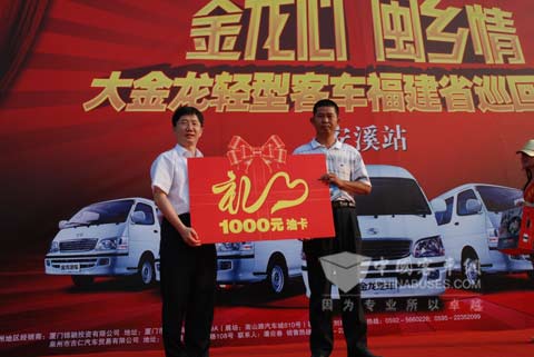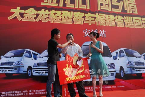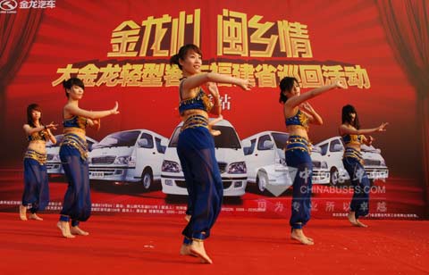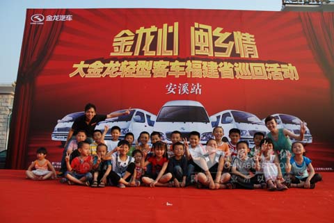 2009年6月6日,“金龙心•闽乡情”大金龙轻客(厢式货车)下乡福建省巡回活动在泉州市安溪茶都举行。本次活动中,大金龙共携带旗下9款精品A+海狮轻客及多功能厢式货车同台亮相。在现场工作人员不仅向当地民众详细介绍了国家“汽车下乡”相关政策,还为当地民众奉献了一场精彩的文艺演出。最后活动在茶都民众热烈的掌声中结束。