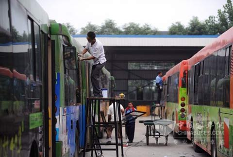 6月13日,在成都市客车厂,工人正在清除原车侧窗。