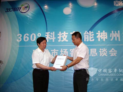 中通客车总经理时洪功向安徽运管局习局长赠与《科技节能白皮书》