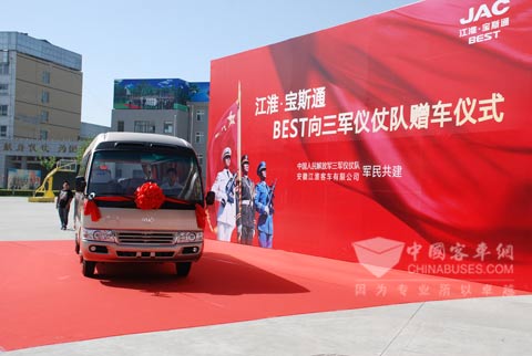 2009年6月28日上午,北京。阳光直泻到中国人民解放军三军仪仗队的操练场上,一辆崭新的江淮宝斯通公务商务客车“精神抖擞”地停在操练场的一侧,它将带着江淮集团对子弟兵的深情厚意而服务于三军仪仗队。