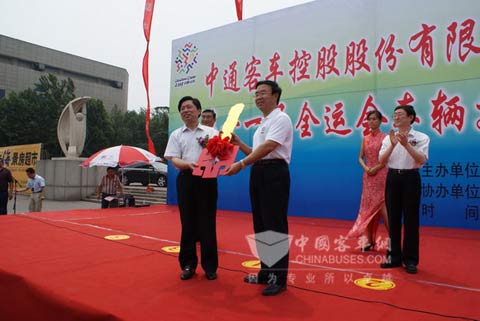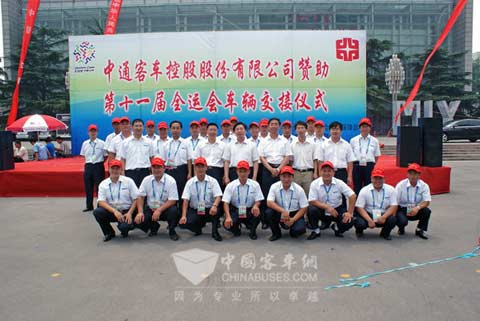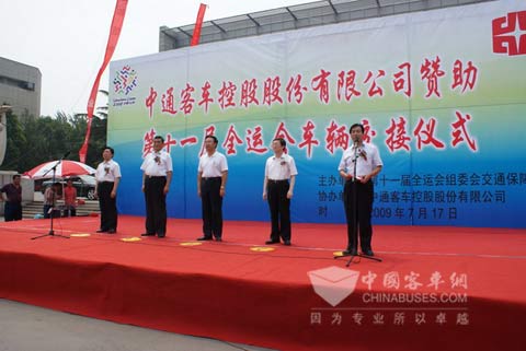 2009年7月17日上午11时,中通客车赞助全运会首批20辆车交车仪式在山东省体育馆北门广场隆重举行。十一运组委会副主任兼秘书长、山东省副省长黄胜,组委会常务副秘书长、山东省省政府副秘书长司安民,山东省交通厅副厅长胡志明,中通客车控股股份有限公司总经理时洪功等领导同志以及组委会交通保障部等有关部室、济南网球竞委会、中通客车全运会服务人员和新闻记者等80余人出席了仪式。仪式由交通保障部副部长、山东省公安厅交管局政委田玉国主持。中通客车总经理时洪功和山东省交通厅副厅长胡志明分别代表中通客车和交通运输厅致辞。