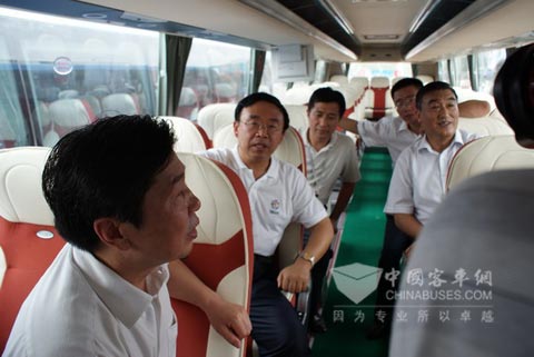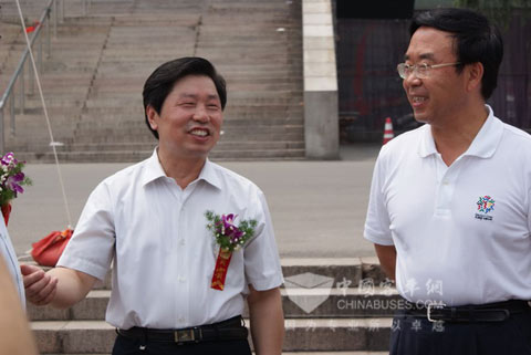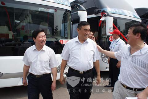 随后,双方进行了交车仪式。十一运组委会副主任兼秘书长、山东省副省长黄胜从中通客车总经理时洪功手中接过了象征首批20辆赞助车辆的车钥匙。交接仪式后,与会人员共同查看了这20辆客车,黄胜副省长等组委会领导对车辆外观标识、车辆性能和品质表示满意。